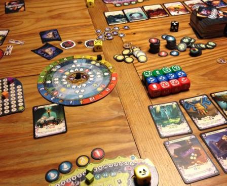 There are new cards with abilities modifying the core of the game in interesting ways, like blocking someone else's familiar, rerolling the die not chosen by any player or straigthening once-used card (for 1 crystal) to use it again this turn. The main power of this expansion lies in the concept of the Die of Destiny.