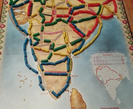India from Ian Vincent On this game board for 2-4 players, in addition to scoring points for claiming routes and completing tickets, a player can also score points in two other ways. First, the player with the longest continuous path of trains receives a ten point bonus. Second, each player scores bonus points for connecting the cities on one or more tickets with two distinct routes. The first two such tickets earn five additional points each, and the next three earn ten points each for a maximum bonus of 40 points.