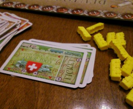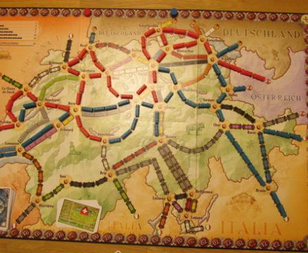 Switzerland from Alan R. Moon This is a reprint of Ticket to Ride: Switzerland, first published in 2007. This game board is for 2-3 players only. Instead of connecting only cities, some destination tickets connect a city to a country or one country to any of those surrounding Switzerland; a player who completes such a ticket scores the highest point value for which she qualifies. Unlike most other TtR games, discarded tickets are removed from the game instead of being returned to the ticket deck. Also, Locomotives can be used only to build tunnels.