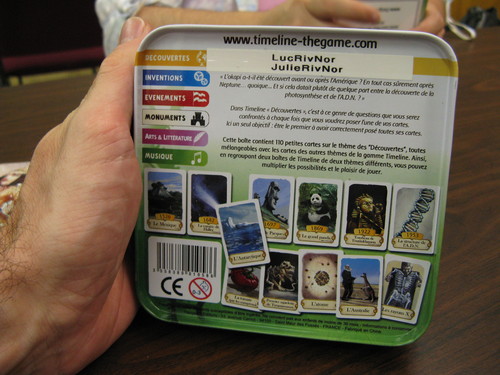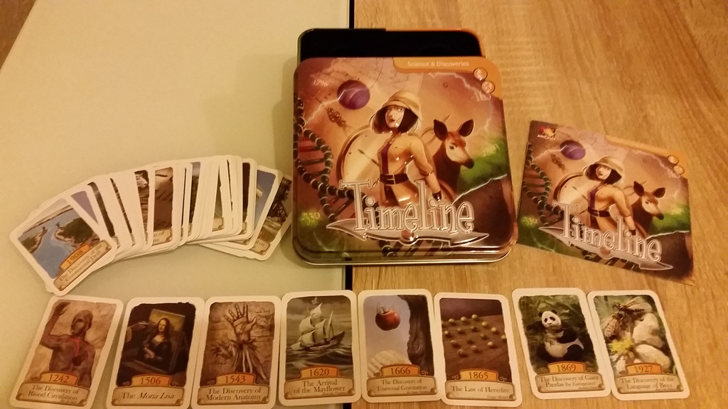 Timeline: Discoveries is a card game played using 110 cards. Each card depicts an discovery on both sides, with the year in which that discovery occurred on only one side. Players take turns placing a card from their hand in a row on the table. After placing the card, the player reveals the date on it. If the card was placed correctly with the date in chronological order with all other cards on the table, the card stays in place; otherwise the card is removed from play and the player takes another card from the deck.