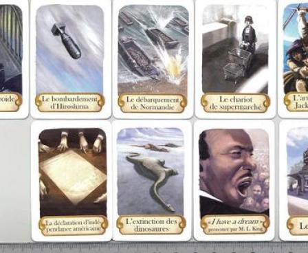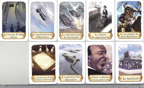 Timeline: Events is a card game played using 110 cards. Each card depicts a historical event on both sides, with the year in which that event occurred on only one side. Players take turns placing a card from their hand in a row on the table. After placing the card, the player reveals the date on it. If the card was placed correctly with the date in chronological order with all other cards on the table, the card stays in place; otherwise the card is removed from play and the player takes another card from the deck.