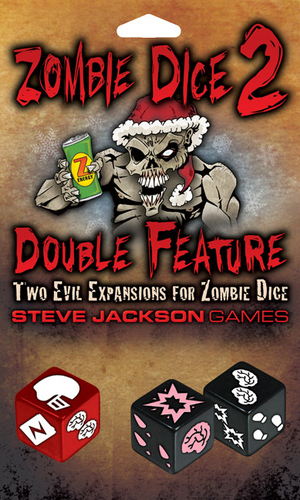 Zombie Dice 2: Double Feature includes three new dice for Zombie Dice and – true to its name – is two expansions in one package.