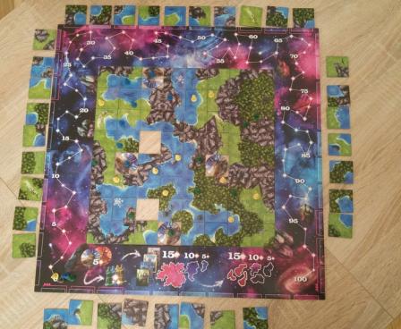 In more detail, players sit outside of a cardboard frame that represents the limits of the world. Each player starts with two randomly-drawn tiles in hand, with each double-sided tile depicting 1-3 types of landscape out of the four types present in the world.