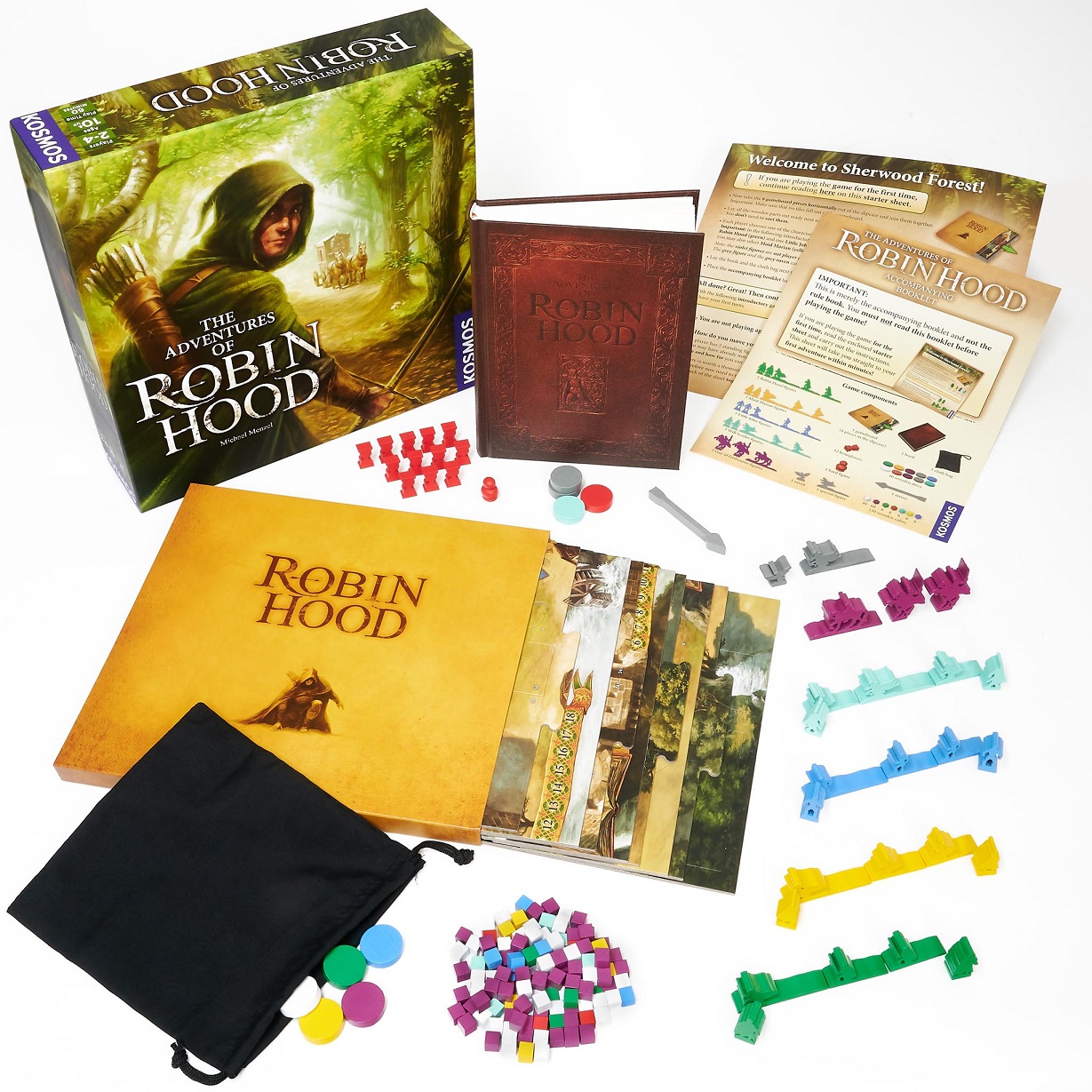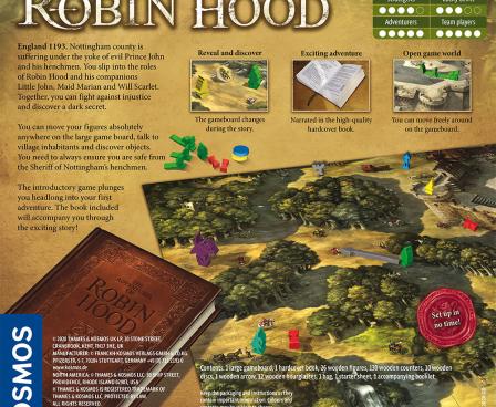 The year is 1193, and the county of Nottingham, England is suffering under the oppressive rule of the corrupt Prince John and his henchmen. In this cooperative family board game, players take on the roles of Robin Hood and his Merry Men as they battle the wicked rulers in the city and throughout Sherwood Forest. Designed and illustrated by Michael Menzel, the award-winning creator of the Legends of Andor game series, this game features a beautifully illustrated gameboard that changes over the course of the game and a gorgeous, faux-leather-bound, 216-page hardcover storybook that narrates the story and advances the gameplay. An innovative game mechanic allows you to move your character figures freely around the gameboard; you do not need to follow one set route. The gameboard also has interactive panels that are flipped to reveal hidden characters and new gameplay elements during play. As your quest progresses, you open these panels and speak to various characters who alter your course. A quickstart game in the rulebook effortlessly launches you into the action. Grab your bow and arrow and join the fight for justice and equity!