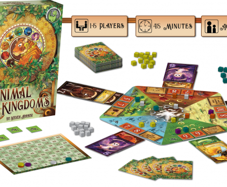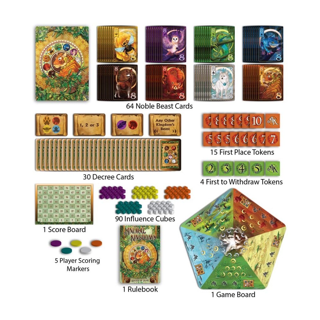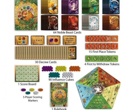 In Animal Kingdoms, each player takes on the role of a house leader, battling to gain control of the five kingdoms. Cards in your hand represent noble beasts that have pledged their allegiance to you. Over the course of three ages, you must deploy your beasts to the various territories – making sure that you adhere to each kingdom’s decree – to try and improve your influential position in the kingdoms. The house that gains the most influence by the end of the third age is declared the one true leader of the realm.