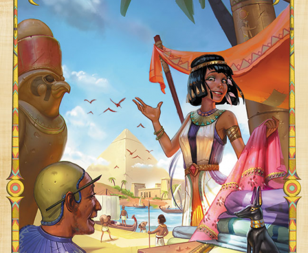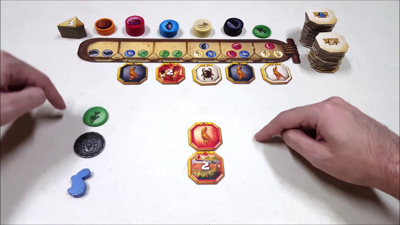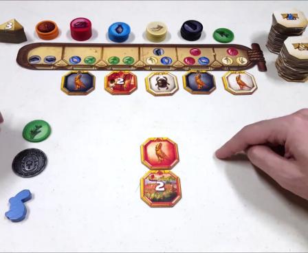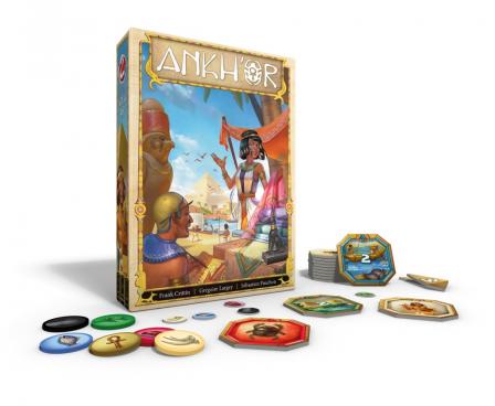 Ankh'or is a quick-playing resource management game in which each player on their turn either collects three types of tokens (with an ankh being a supplemental resource) or buys a tile from a marketplace and adds this tile to their structure, trying to connect tiles of the same color or bearing the same scarab while doing so. By spending an ankh, you can shift tiles in the marketplace and change the cost and type of goods needed to purchase them.