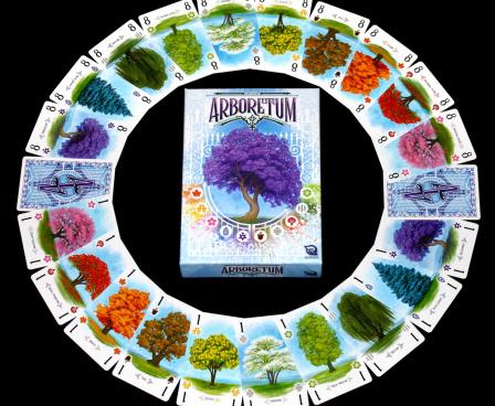 The deck has 80 cards in ten different colors, with each color featuring a different species of tree; each color has cards numbered 1 through 8, and the number of colors used depends on the number of players. Players start with a hand of seven cards. On each turn, a player draws two cards (from the deck or one or more of the discard piles), lays a card on the table as part of her arboretum, then discards a card to her personal discard pile.