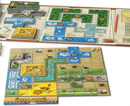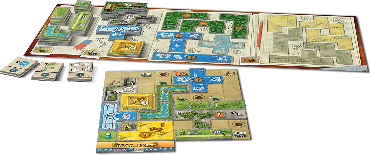In more detail, each player in Brenpark builds their own bear park, attempting to make it as beautiful as they can, while also using every square meter possible. The park is created by combining polyomino tiles onto a grid, with players scoring for animal houses, outdoor areas, completed construction, and more. The sooner you build it, the better! Cover icons to get new tiles and park sections. The game ends as soon as one player has finished expanding their park, then players tally their points to see who has won.