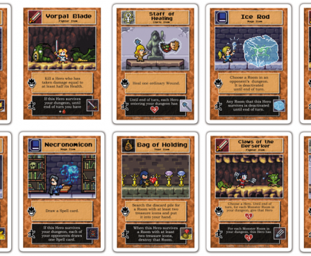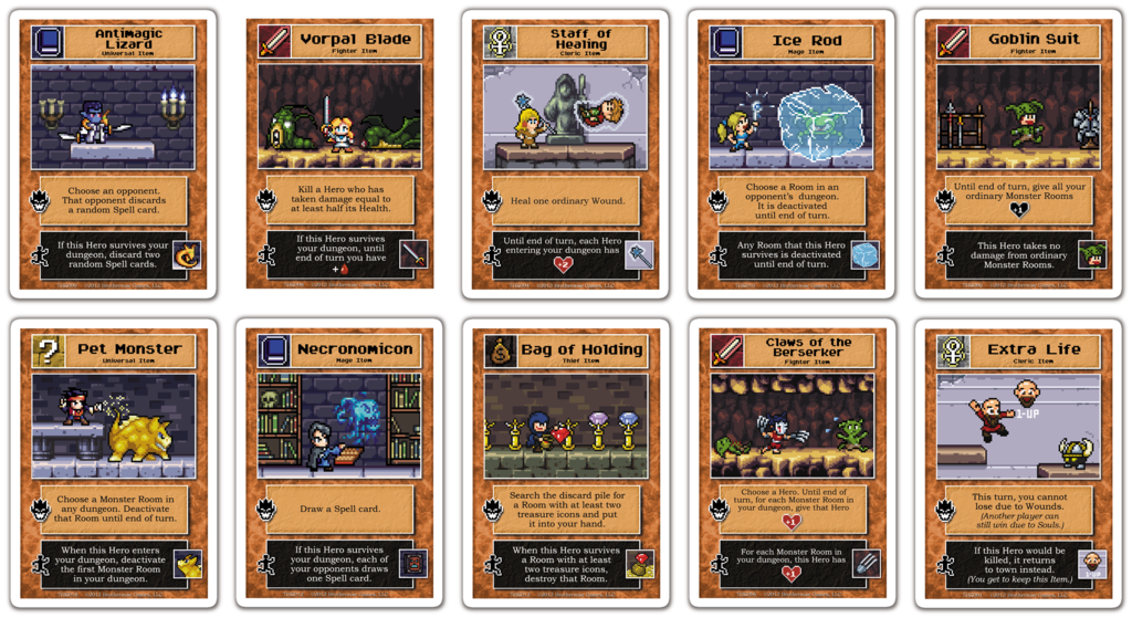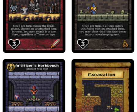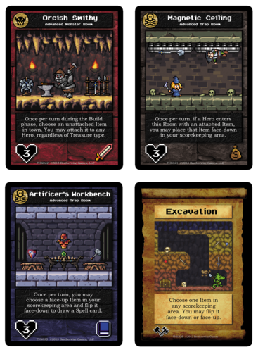 With the introduction of Item cards, Tools of Hero-Kind will transform the adventurers exploring your dungeon. They'll go from being a resource that you harvest into an undeniable threat. Magical weapons, armor, items and scrolls will attach themselves to Heroes as they come into town and confer their "Power-Up" abilities. Of course, with bigger risks come bigger rewards. Should you manage to defeat a hero carrying an Item, you'll be able to use the one-time "Reward" effect of that item to further your own nefarious goals.