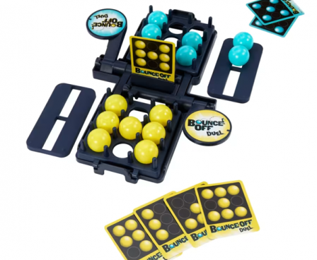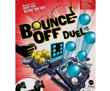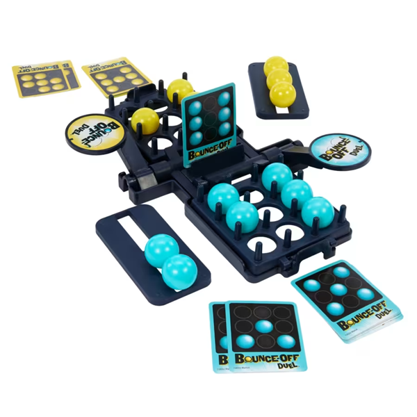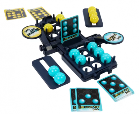 The Bounce-Off Duel 2-player game features high-energy, head-to-head action based on the original ball-bouncing pattern-matching challenge with no batteries required! Both players bounce balls into their side of the game tray at the same time, trying to match the pattern on the card. When one player completes the challenge, they slam their paddle and BOOM! The opponents' balls go flying! Time for a rematch!!! Bounce-Off Duel is a ball-bouncing face-off, perfect for any game night with kids, teens or adults!