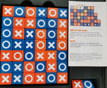 In more detail, the bricks are effectively two cubes pushed together, with half the brick being orange and the other half blue; when an orange face shows an X, the blue face shows an O and vice versa. Each turn the active player adds one brick to the wall either vertically or horizontally, with each new brick connecting to existing bricks on at least one face and at most eight symbols in a horizontal row. If no one has won by the time that all bricks are in the wall, then on their turn players remove one brick and place it in a new location; if you knock the wall over on your turn, you lose.