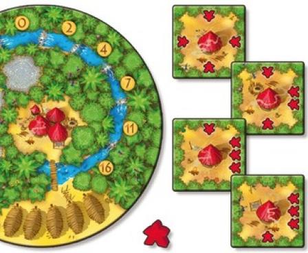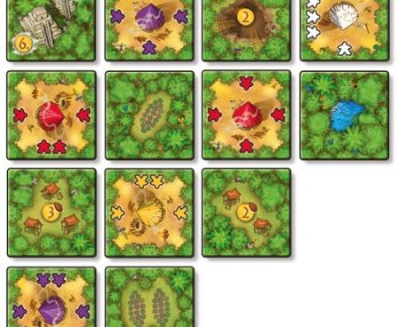 In the game, each player has an individual deck of square worker tiles, with the number of workers on each side of the tile varying from tile to tile. The playing area starts with only a couple of jungle tiles in play: a cacao field and a small market; two jungle tiles are laid face up, and the remaining jungle tiles stacked as a draw pile.