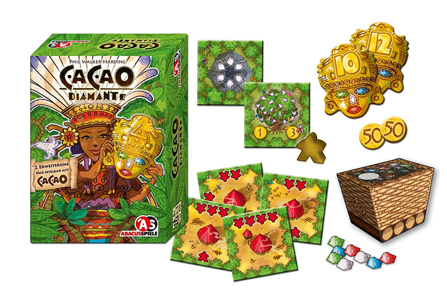 Cacao: Diamante contains four expansion modules for the Cacao base game: The gem mines, the tree of life, the Emperor's favor, and the new workers. All modules can be played individually or combined with others, whether from this expansion or the Cacao: Chocolatl expansion. With the "Big Game" variant, you can even play with all modules of both expansions and the base game.