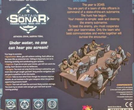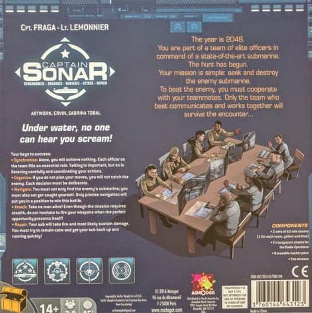 In Captain Sonar, you and your teammates control a state-of-the-art submarine and are trying to locate an enemy submarine in order to blow it out of the water before they can do the same to you. Every role is important, and the confrontation is merciless. Be organized and communicate because a captain is nothing without his crew: the Chief Mate, the Radio Operator, and the Engineer.