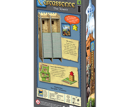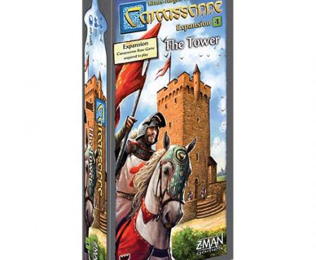The Tower is the fourth major expansion for the Carcassonne game. Tower segments are added to the game, as well as some new actions. Instead of placing a Meeple as usual on their turns, players can now either place a tower segment on a tile with a space for a tower, add a tower segment to a tower already standing, or place a Meeple on top of a tower (which "finishes" it).