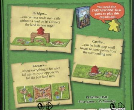 The eighth expansion for Carcassonne, Brücken, Burgen und Basare (English: Bridges, Castles & Bazaars) allows players three new options while playing: