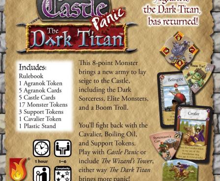 The Dark Titan, an expansion for Castle Panic, adds more powerful enemies to the game, as well as new reinforcements and weapons with which the players can defend the castle. The Dark Titan Agranok is a new 8-point monster seeking vengeance, and his support includes the Dark Sorceress, elite monsters, and a boom troll. To defend against these new threats, players will have a Cavalier that fights for them on the board as well as boiling oil and support tokens.