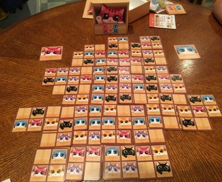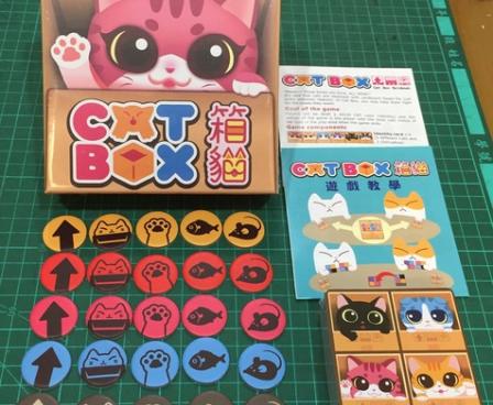 Cat Box is played with cards divided into quadrants each showing an empty box or one of five cats (in a box). Players take turns playing these cards to a shared display, overlapping previous cards by one or two quadrants. Each player is assigned a secret identity; if you are a cat you want as many of your cats showing at the end of the game as possible, and as large a group of them as possible, but if you are the chihuahua you want empty boxes and groups of exactly three cats.