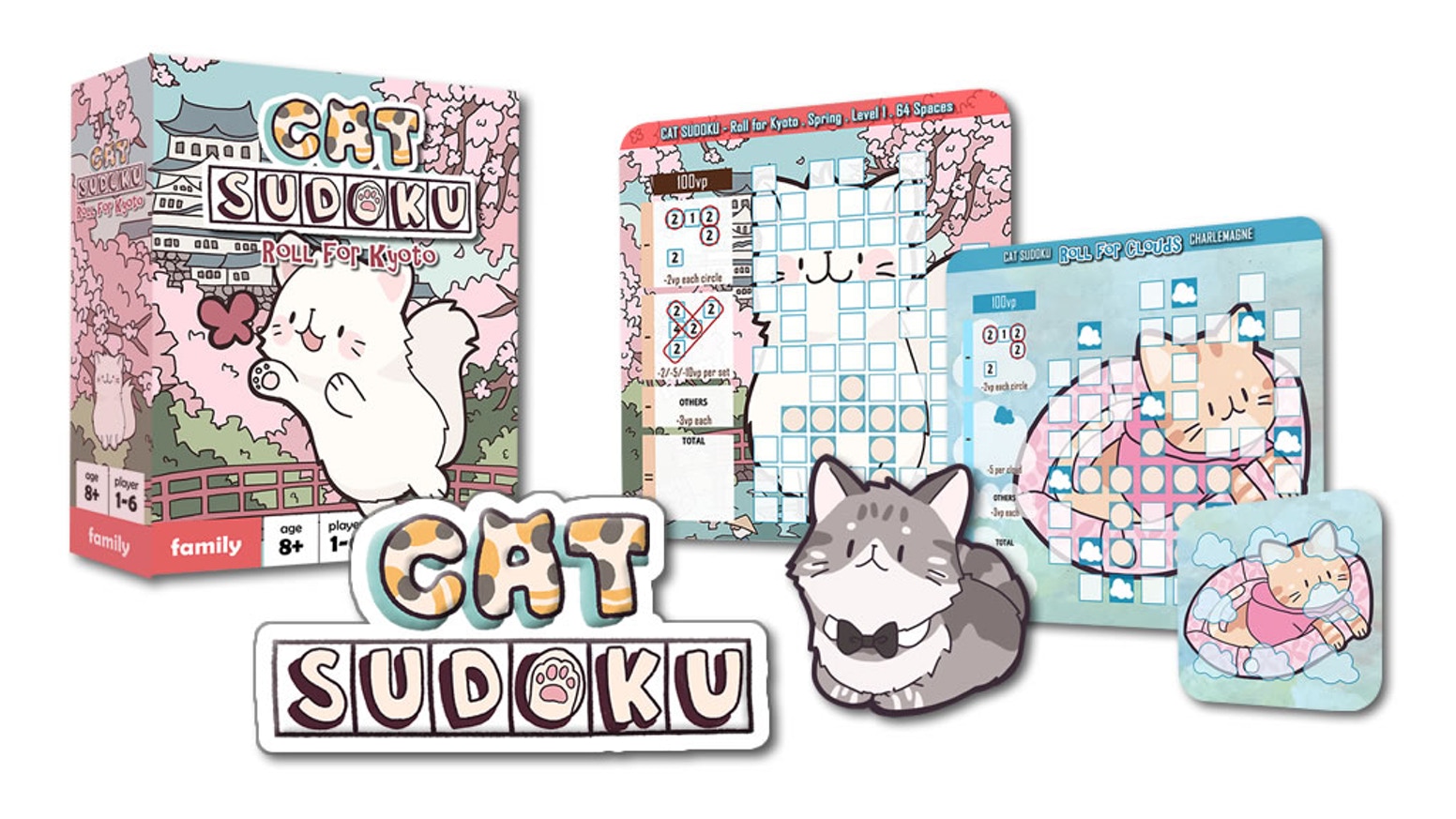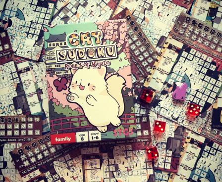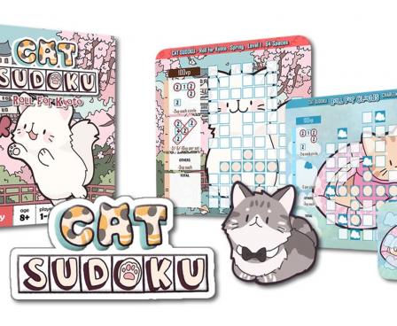 Cat Sudoku is a roll-and-write sudoku game for 1 to 6 players. In the game, players take turns to roll four dice and all players simultaneously write the numbers on their sudoku puzzle papers. Similar to traditional Sudoku, players should avoid putting the same number into the same row or column in their puzzle, or they will get minus points! The game ends when players fill in all the spaces in the puzzle. The player with the highest points wins the game.