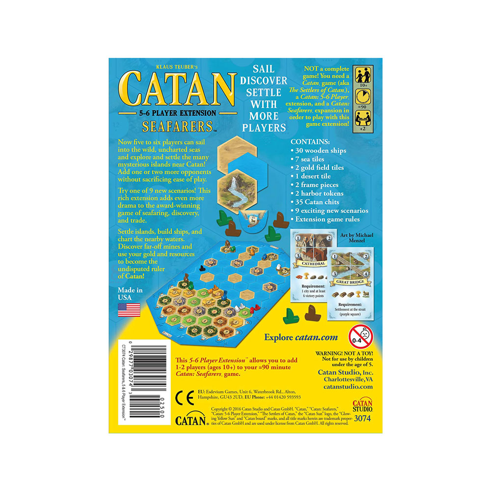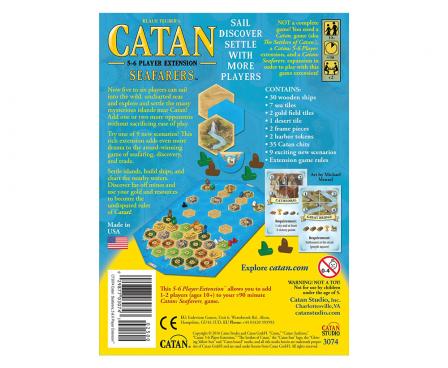 Now five to six players can sail into the uncharted and explore and settle the mysterious islands near Catan! The 5-6 Player Expansion for The Seafarers of Catan allows you to add 1-2 more opponents without sacrificing ease of play. Try one of ten new exciting scenarios! Designed for 5-6 players, it adds even more drama to the award-winning game of seafaring, exploration, and trade.