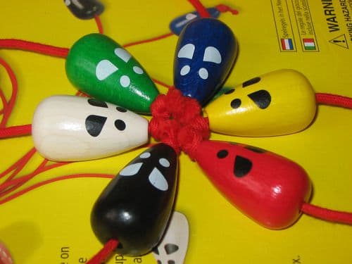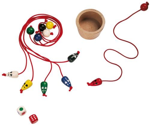 One player becomes the cat, while the others are mice. The cat rolls a die with six different colors on it, and then attempts to catch the corresponding player's mouse with a little wooden cup. (In order to avoid smooshing of little fingers, each mouse is connected to a cord!)