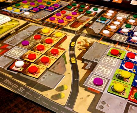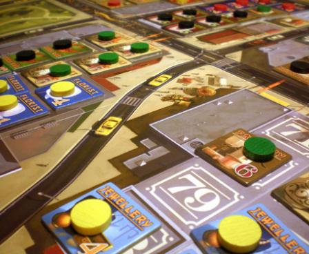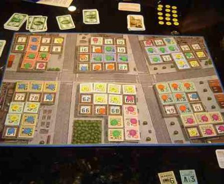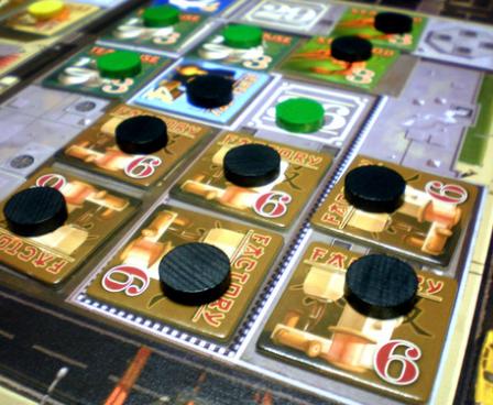 This is a negotiation game in the truest sense of the word. In it, players acquire ownership of sections of city blocks then place tiles, representing businesses, onto the block-sections. At the end of each turn, each tile you've laid gives you some sort of payout, but completed businesses (formed of three to six connected tiles of the same type) pay quite a bit better. All these resources are dealt to the players randomly, however, so players must trade to get matching businesses and adjacent locations.
