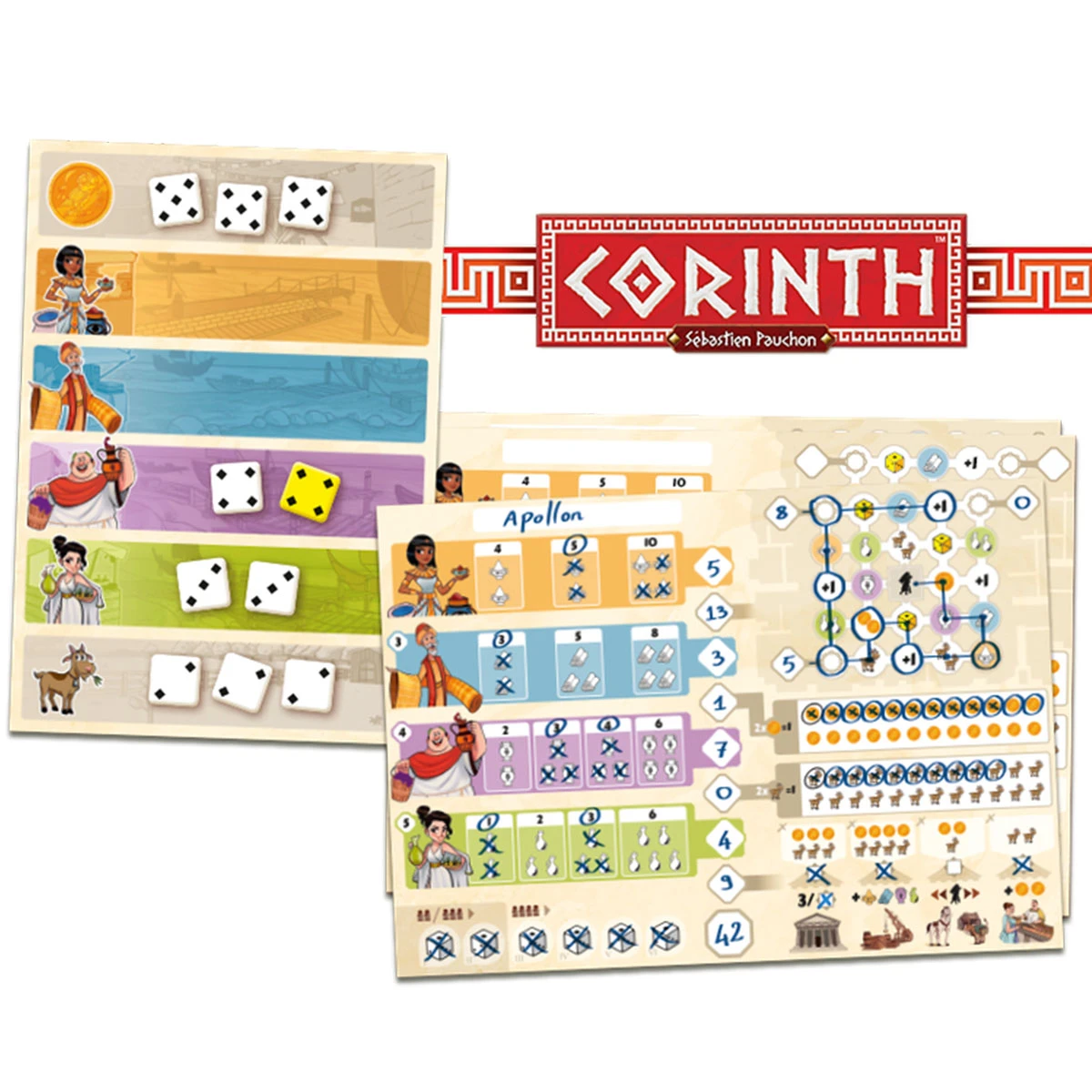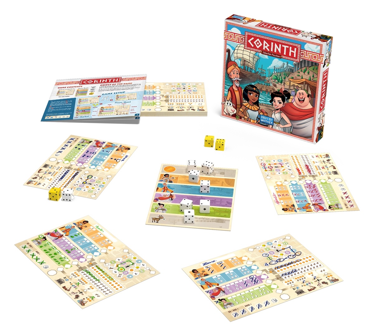 Corinth is a roll-and-write game akin to a dice-only version of the board game Yspahan. At the start of a turn, the active player rolls nine dice, then places all the dice with the highest value on the gold space at the top of the chart, then starts placing dice from the bottom of the chart up, with each value of dice being on a separate level.