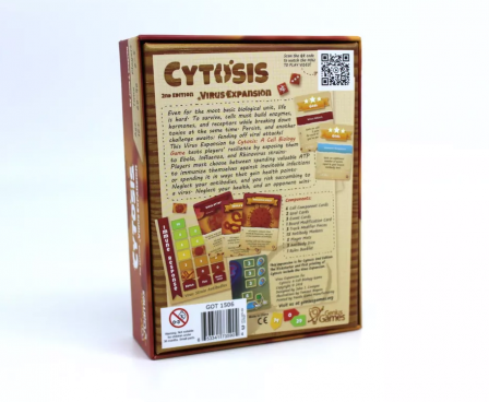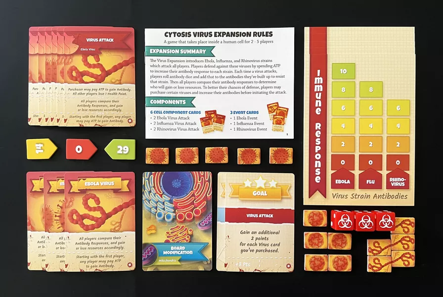 The Virus Expansion expands upon the base game for Cytosis. The expansion adds Influenza, Rhino Virus and Ebola. Player may pay ATP to build up their antibodies to each of the three viral strains. When a Virus attacks, all players will roll a number of antibody dice according to their level of health and add it to the antibodies they've accumulated throughout the game. The player with the highest antibody response will gain resources while the player with weakest antibody response will lose resources.