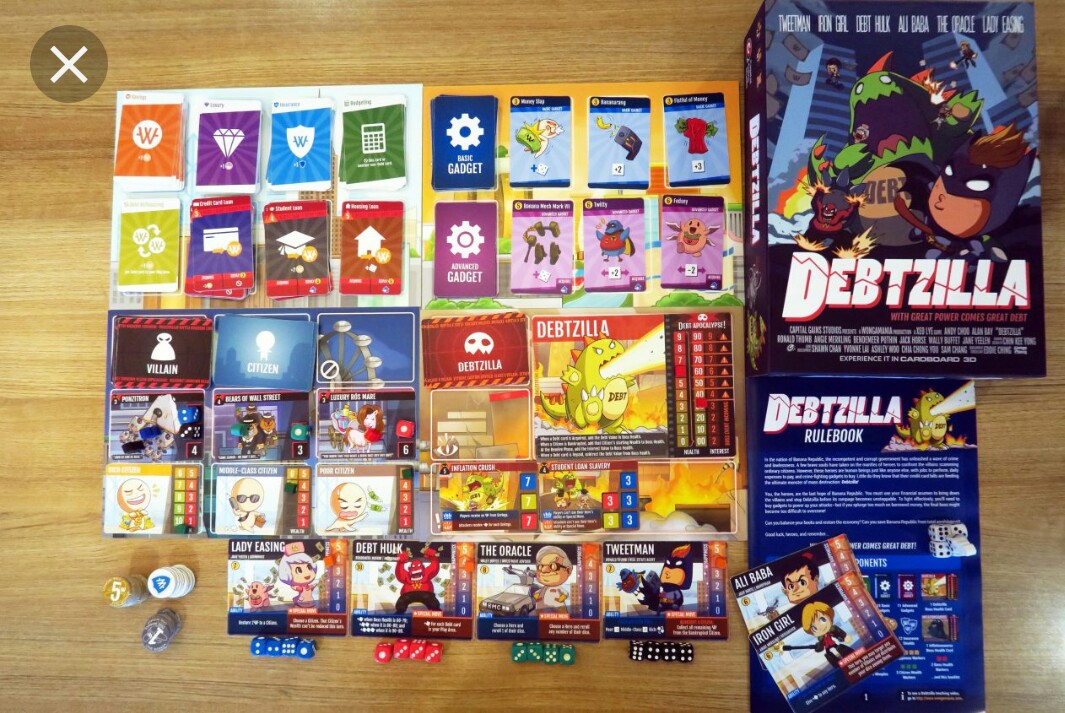 Debtzilla is a 2 to 4 player, cooperative board game in which heroes work together to protect ordinary citizens from being scammed by Villains, and take down the final boss: Debtzilla. Sharing the same universe as Wongamania: Banana Economy, Debtzilla focuses on the issue of how debt affects the lives of ordinary people in Banana Republic. Using a combination of deck building and dice mechanics, players have to race against time to bring down the bad guys before the law of compounding debt interest destroys their chances of winning the game. Be too stingy on your finances and you will find your hero too weak to do any good in a real fight. On the other hand, splurging too much on those flashy hero gadgets on borrowed money will result in the final boss too difficult to defeat. Can you balance your books and save the world at the same time?