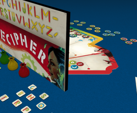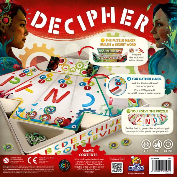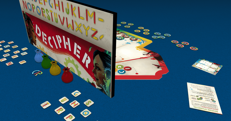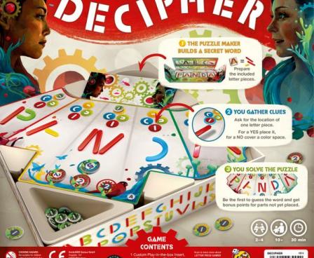 Decipher is a different kind of word game for 2–4 players. Players use four differently-shaped letter pieces to create and solve word puzzles. In each round, a different player builds a secret word puzzle. The others know only which letter pieces are in the secret word and gather clues and points by asking about where letter pieces go. Can you decipher the the secret word?