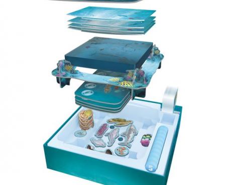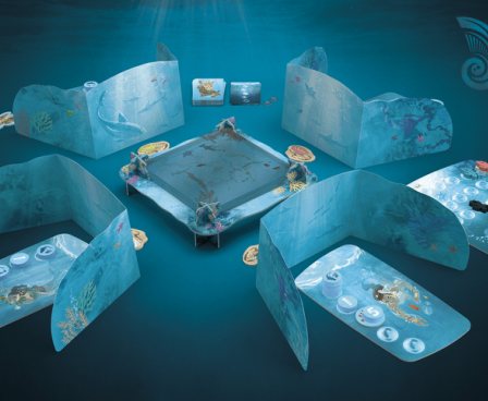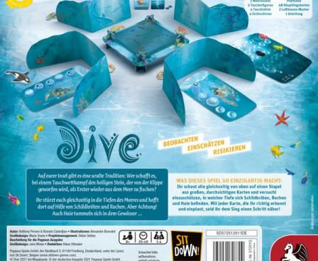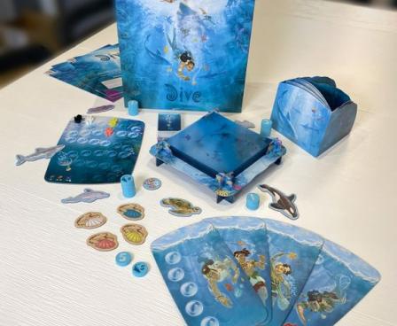 Dive explores the notion of perception, the ability of the divers to observe the ocean through a deck of transparent cards and to benefit from their observations. At the start of each round, you look into the "waters" before you to see how far you want to dive, with five levels being the maximum you can go (since you have five tokens). You then place the tokens on your board: