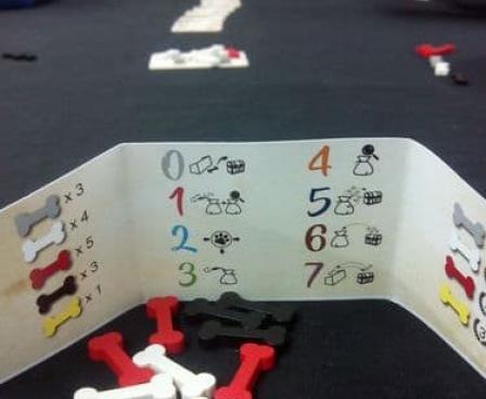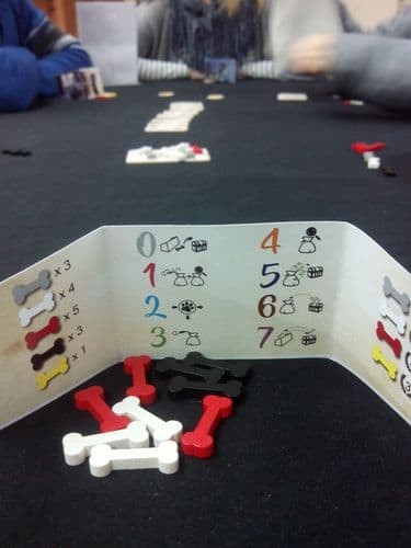 In the risk-taking game Doggy Bag, each player must add 2 to 4 bones to the shared bag at the beginning of each round in order to avoid Fagin's wrath. Then each player decides how many bones they will try to take back at night by playing a special action depending on how daring they are. While some bones are worth more than others, you have to be careful of those whose smell would wake up Fagin to avoid being caught red-handed.