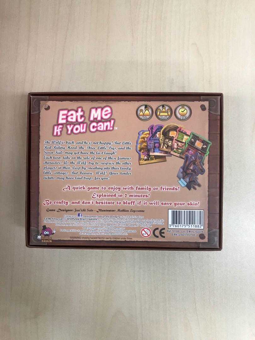 In Eat Me, If You Can, the wolf player tries to eat one of the other players to score points while the players, being prey, score by trapping the wolf. In each round, one player is the wolf and the other players are given Little Red Riding Hood (worth 3 points), Mother Pig (2 points), or a little piggy (1 point). Each non-wolf player then secretly chooses one of two cards in hand: Will the player sleep and rest, hoping not to be disturbed by the wolf? Or will the player set up a trap, thinking that the wolf will be coming for her? Once the players lay down their cards, the wolf chooses one of the players. If this player went to sleep, the wolf takes points from this player equal to the value of her character; if she set up a trap, on the other hand, she takes points from the wolf. Everyone else who rested this round scores points from the bank for their character — but only if they got their beauty sleep!