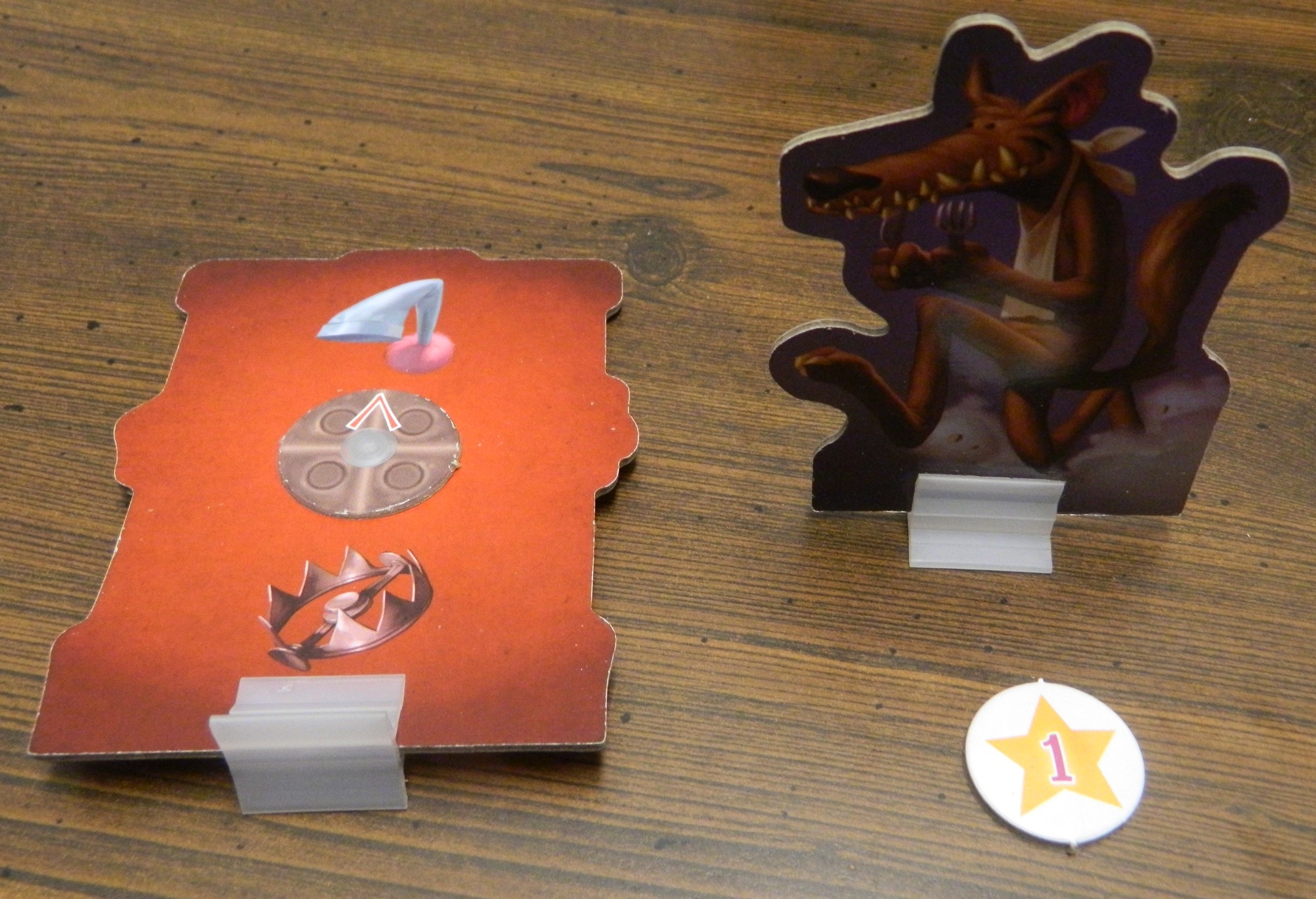 Whoever lost points that round becomes the wolf for the next round and hands out the character cards to players as she wishes. As soon as a player has ten or more points, the game ends and the player with the most points wins.