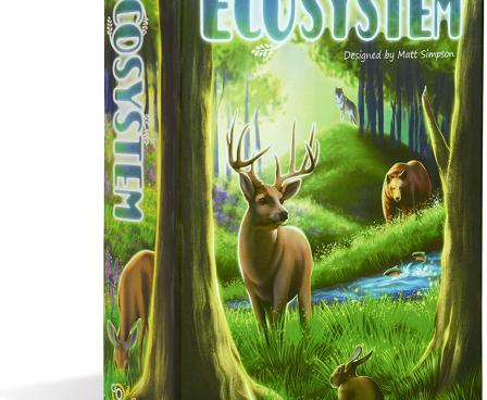 Ecosystem is a card-drafting game in which players choose cards and place them into their play area turn by turn. The cards in a player's grid make up their own personal ecosystem, and at game's end, a player will have twenty cards in their ecosystem, with the game including eleven types of cards. Bears score by being placed next to bees and trout; trout score by being placed next to streams and dragonflies; and streams are compared at the end of the game, with the player who has the largest stream earning points. These are just a few examples of how scoring works in Ecosystem. Don't forget to diversify!