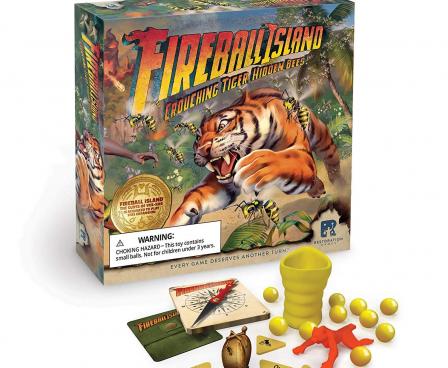 Let’s make one thing perfectly clear: The island is out to get you. Fireballs, of course. But there’s a whole lot more on the island that will have you running for your life. This smaller expansion introduces two new threats. The crouching tiger introduces a dexterity shot. Place it on the table next to the board, press down, and launch it towards your foes. The hidden bees make up for their smaller size with their swarming numbers. Put all the little yellow marbles into the beehive, pour them through Vul-Kar, and watch the mayhem ensue.