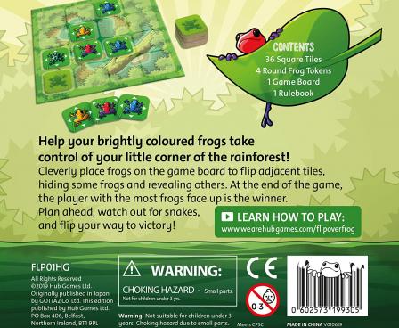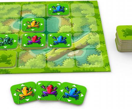 Cleverly place frogs on the game board to flip adjacent tiles, hiding some frogs and revealing others. Each player is given a secret Frog Token at the beginning of the game, determining what colour frogs they are trying to get on to the board. After dealing three tiles to each player, the game begins. Tiles can be placed on any empty space on the 4x4 board, or on the back of any face down tile. Frogs may NOT be placed on top of face up tiles.