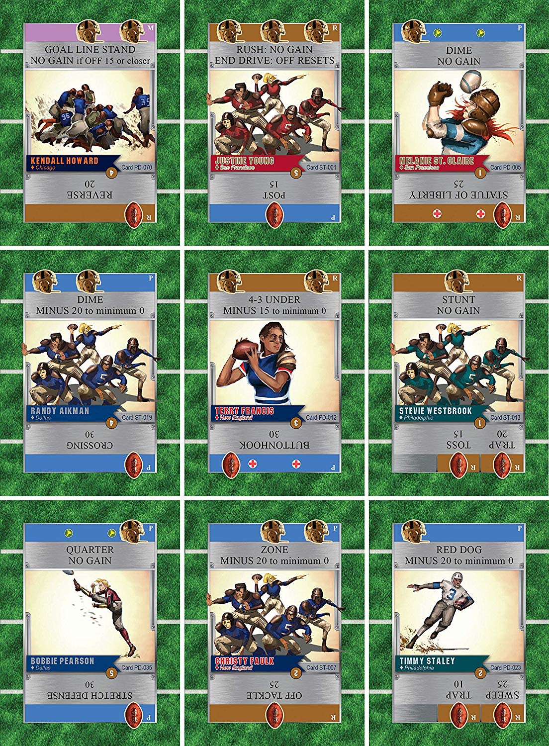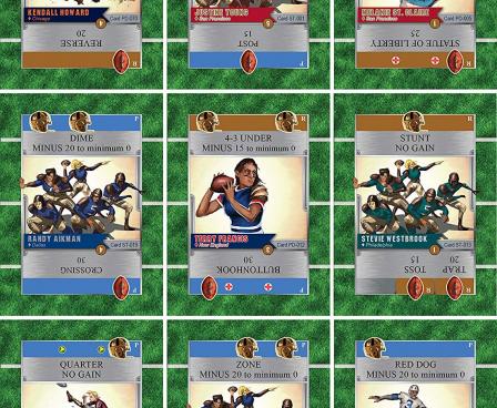 In this quick and interactive game, two players manage their teams, combining both strategy (building your team) and tactics (playing the game) without any downtime. During each half, players alternate playing ten cards to simulate a full game's highlights. Each card represents both an offensive and a defensive play, both of which will be used to resolve your opponent's and your own offensive plays.