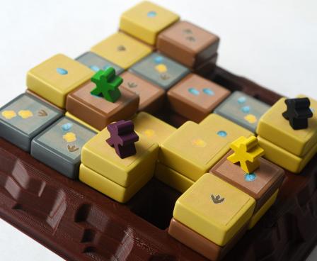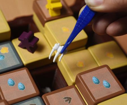 Fossilis features a unique 3D dig site board, with recessed pockets filled with dinosaur bones, and thick, chunky terrain tiles that cover the dig site. Players have to use strategy, timing, and a little bit of luck if they want to make the best discoveries, get their name in all the paleontology journals, and of course, win the game.
