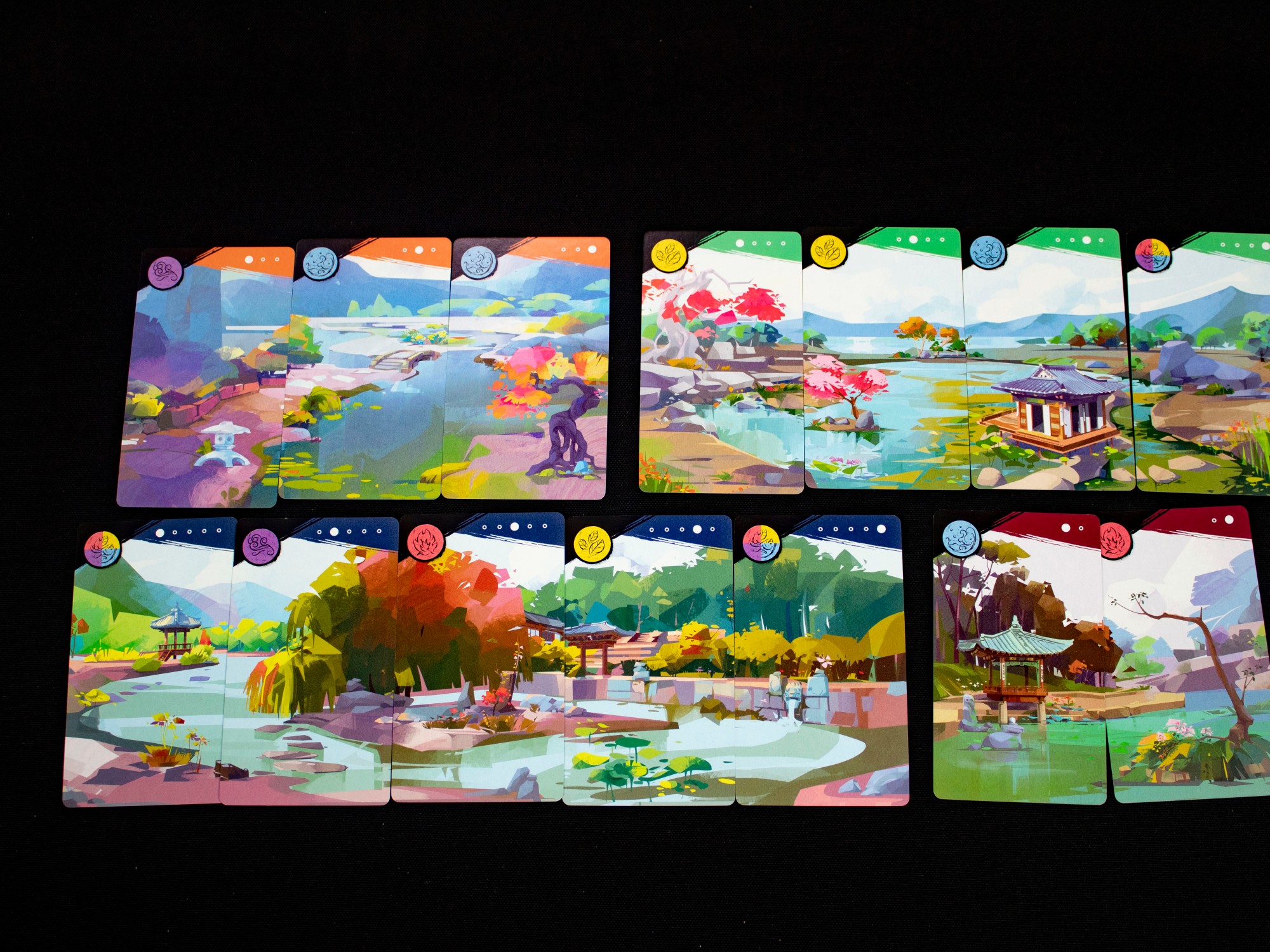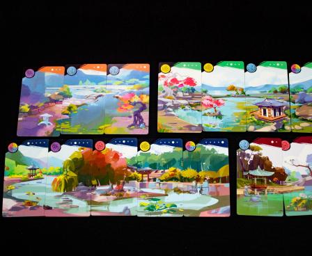 The goal of Four Gardens is to accumulate the most points on the score board by completing landscape cards and finishing sets. Each finished set creates a panoramic view of a garden, and these sets are called (no surprise) "panoramas".