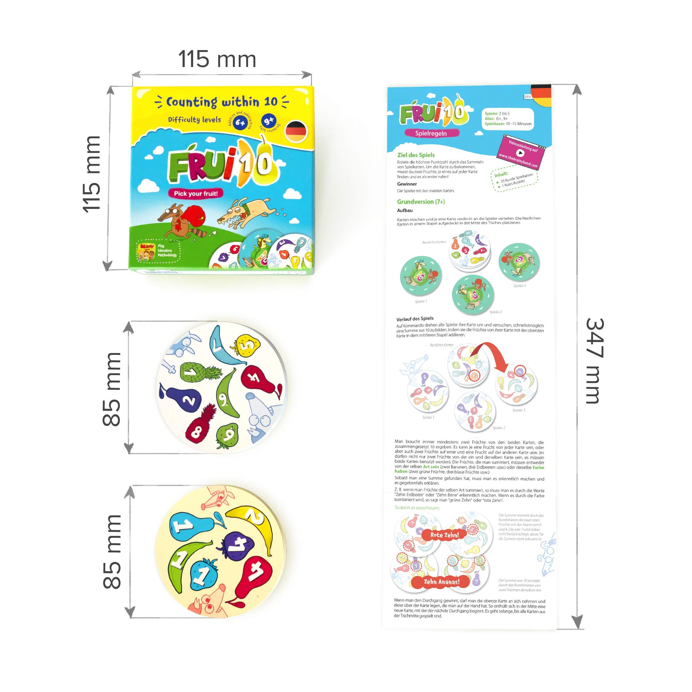 The set includes additional 15 cards for playing with younger kids. There are fruits with digits from 1 to 4 on these cards. The rules of the game are the same as for «Frui10», but instead of the sum of 10 you need to look for the sum of 5.