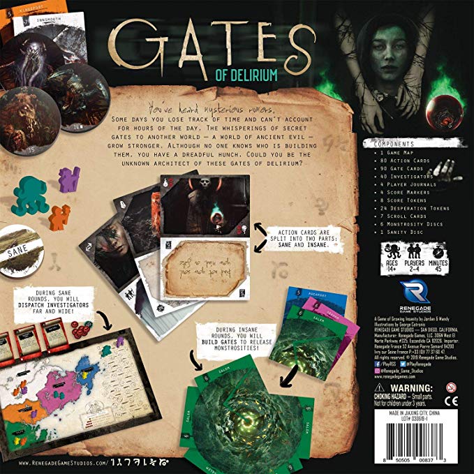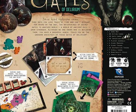 In Gates of Delirium, players have a hand of split action cards: one side sane, and the other insane. Every round, one player decides whether the round is sane or insane, and all players must play that side of their cards. During sane rounds, players search for maps and lost pages to a secret tome, while assigning investigators to help them in their cause. During insane rounds, players collect ancient runes and work to build gates to release the monstrosities that their sane selves have been trying so hard to understand and prevent. Earn the most victory points by the time the last monstrosity is released to win Gates of Delirium.