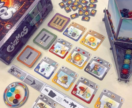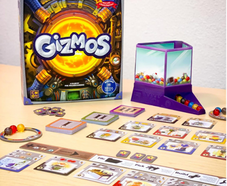 In Gizmos, you want to build engines — engines within the game to get things done faster. Using the four types of energy marbles, plucked from the 3D marble dispenser, you purchase and construct new additions to your works. As you build, new attachments can trigger chain reactions, letting you do even more on your turn. Whoever builds the greatest machine and collects the most victory points wins!