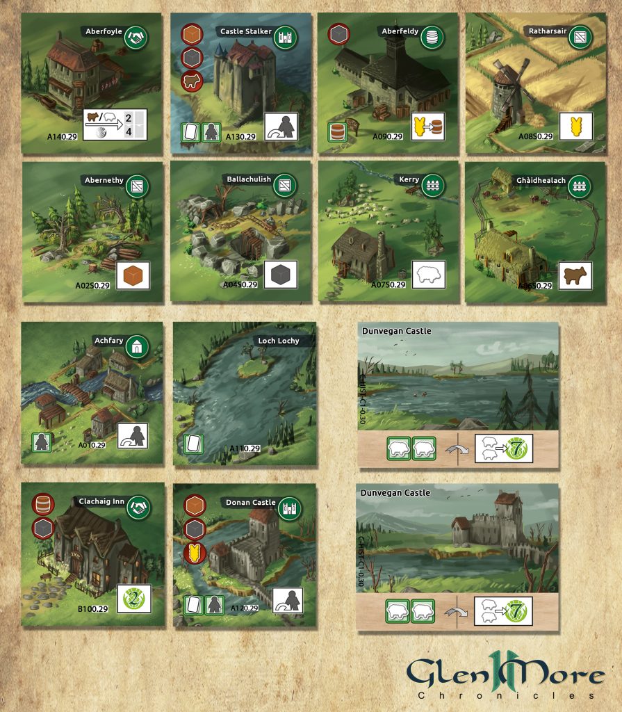 In Glen More II: Chronicles, each player represents the leader of a Scottish clan from the early medieval ages until the 19th century, a leader looking to expand their territory and wealth. The success of your clan depends on your ability to make the right decision at the right time, be it by creating a new pasture for your livestock, growing barley for whisky production, selling your goods on the various markets, or gaining control of special landmarks such as lochs and castles.