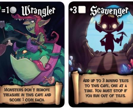 Once everyone has placed all of their goblins (or decided not to place them), players resolve the boards. The goblin on the guildhall draws a minion card that provides a special ability, while each goblin in a cave scores coins based on the gems, diamonds, dynamite and monsters found there; these goblins can also take minion cards if minion tiles have been placed in the cave. Dynamite multiplies the value of a cave, but three or more sticks blows the place up, costing you coins.