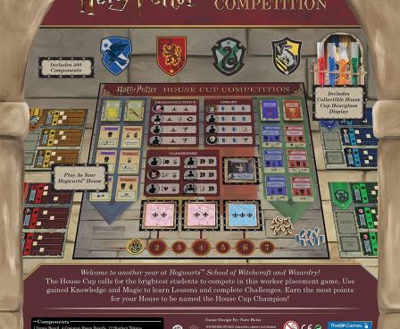Welcome to another year at Hogwarts School of Witchcraft and Wizardry! The House Cup calls for the brightest students to compete in this worker-placement strategy game. In Harry Potter: House Cup Competition, use gained knowledge and magic to learn lessons and complete challenges. Players send iconic characters like Harry Potter, Cedric Diggory, Cho Chang, and Draco Malfoy out on the game board to enhance their skills. The player who earns the most points for their House will be named the House Cup Champion!