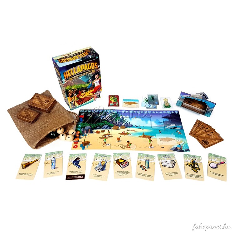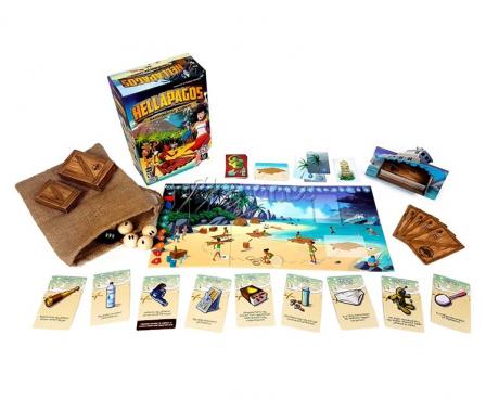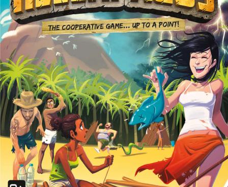Hellapagos is a "co-opetition" game in which players struggle to survive on a desert island and build a raft to escape before a hurricane devastates them. While players need to work together, its not likely that everyone will survive this backstabbing negotiation game for up to twelve players.