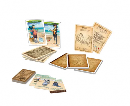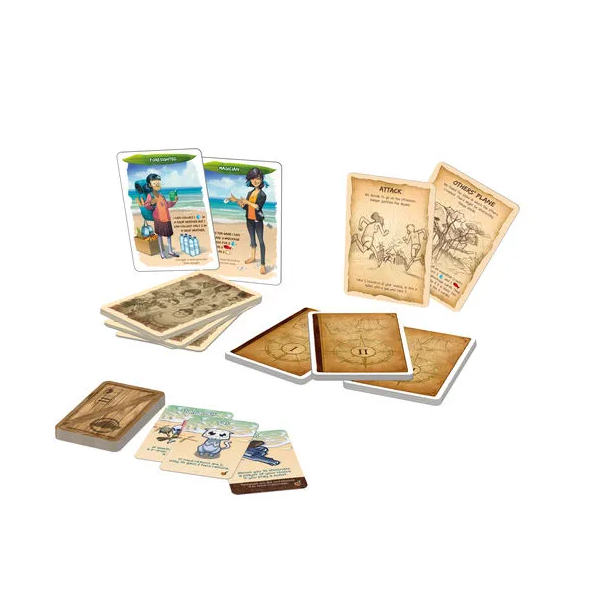 30 event cards featuring another tribe which has been inhabiting the island and how the players interact with them. Event cards are flipped over at the beginning of a round and often include significant decisions to be made by the group or by the first player alone.
