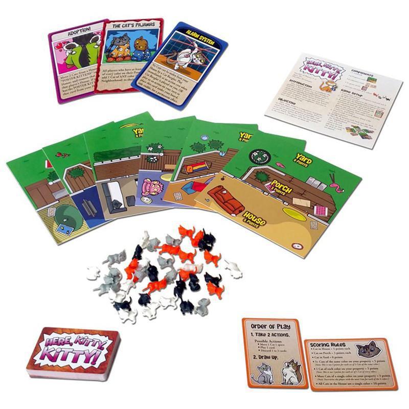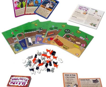 In the crazy cat-collecting game Here, Kitty, Kitty!, your neighborhood has a cat problem, the problem being that the cats don't all belong to YOU! Unfortunately you can't just grab them for yourself as everyone in the neighborhood wants to claim those adorable kitties. Outwit your fellow feline fiends as you lure cats onto your property, move cats into your house, and steal cats from your neighbors. All's fair in love and cat-collecting!