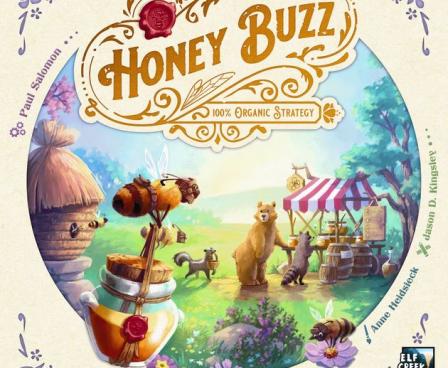 Honey Buzz is a worker bee placement game where players expand a personal beehive by drafting various honeycomb tiles that grant actions that are triggered throughout the game. Each tile represents a different action. Whenever a tile is laid so that it completes a certain pattern, a ring of actions is triggered in whatever order the player chooses. A tile drafted on turn one could be triggered up to three times at any point during the game. It all depends on how the player places their beeples (bee+meeple) and builds their hive. After all, in the honey business, efficiency is queen.
